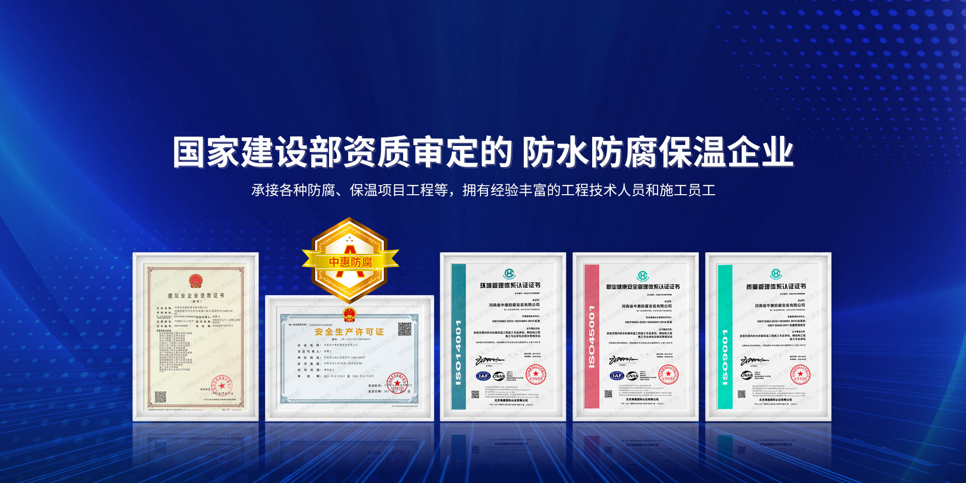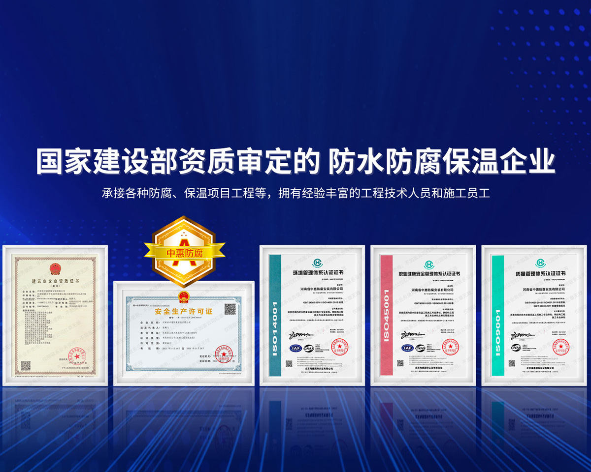 公司經營范圍:防水防腐保溫工程;消防設施工程;建筑裝修裝飾工程;建筑機電安裝工程;電力工程;建筑工程;石油化工工程;工業清洗工程;油罐清洗工程;鋼結構工程;環保工程;模板腳手架工程;電纜防火封堵、防污閃噴涂、外墻外保溫工程;各類施工勞務作業;設備維修、船舶鉚焊、涂裝;電力工程材料、建材、防水材料、防火材料、防腐保溫材料銷售,并相繼通過了GB/T19001-2008idtISO9001:2008GB/T50430-2007質量管理體系認證證書。GB/T24001-2004idtISO14001:2004環境管理體系認證證書。GB/T28001-2011idtOHSAS18001:2007職業健康安全管理體系認證證書。公司是中國防腐蝕于防護協會、中國施工企業管理協會、電力協會和中國鋼結構防水協會會員單位。 公司的經營業務涵蓋了石油、化工、電力、冶金、煤炭、船舶、國防、燃氣、水利、環保、交通運輸、航空及國防軍工和輕紡市政等行業的防腐保溫絕熱設備。鋼結構安裝、防火、防水、金屬噴鍍、聚脲噴繪、陰極保護、防滲透堵漏、玻璃鋼及各種磚版材料襯里、橡膠襯里、煙氣硫和耐酸溶劑腐蝕等工程施工。公司連續十年榮獲“省市先進施工企業”“安全生產先進單位”“重合同,守信用企業”和“AA***資質企業”的稱號。2000年被命名為市級文明單位,2002年被國家工商行政管理局命名為“重合同,守信用的企業”、被中國工業防腐蝕技術協會命名為“防腐蝕企業,能源節約及環境保護領域有豐富的經驗和***的業績。工程一次交驗合格率100%。其中攀枝花鋼鐵公司煉鐵廠四號高爐及熱風爐防腐工程、上海寶鋼公司煤氣柜防腐工程、撫順石油一廠裝置防腐項目、齊魯石化公司稀烴廠高塔防腐工程、吉林化學工業公司煉油廠油罐防腐工程、天津石化熱電廠六號爐頂棚聯絡管保溫工程、大慶油田(太倉)力神泵業工程、中國化學工程第十一建設工程、中原油田勘探局工程、中國石化銷售有限公司華北分部、魯皖輸油管道工程、貴州開磷息烽合成氨工程、陜西黃陵煤化工程、中國石油天然氣西部管道塔里木輸油工程、邯鋼集團邯寶鋼鐵公司煉鐵工程、德州供電工程、吉寶(南通)船廠工程,偃師華潤熱力工程、鄭州熱力總公司。 河南省中惠防腐安裝有限公司愿以豐富的施工經驗,***的技術,***的設備,***的管理,***的服務,竭誠為國內外廣大的用戶提供***滿意、******的工程作品。 我公司愿與國內外同仁一道,團結協作,共同推進防腐蝕行業發展! 公司地址:河南省長垣縣建設路北段360號 固定電話:0373-8866488 郵編:453400 網址:http://www_zhff_com_cn.jnlcdz.com